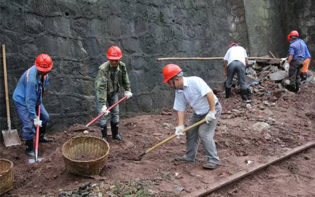 大概半小时后,所有人员、机械、小车集合到位,随即向宜宾南火车站驶去。到达后,何奈再一次逐一核对了人员、物资、设备等情况,待所有妥当后,向大伙下达出发前的指令与动员:大家必须要全力以赴,做好打硬仗的准备,早日排出险情!经过一个小时左右闷罐车车程,又步行约一个小时后,40余人的抢险队伍抵达了受灾现场。一路颠簸及步行已让大伙略显疲惫,何奈随即吹响抢险号角:兄弟们,拿出我们大桥人的精神,干起来!随即带头拿起铁锹,将涌入铁轨内的泥土铲入竹篓子,并指挥队伍分工,指导抢险作业。抢险队伍兵分两路,分别清理被泥土掩埋的铁轨及被石头、泥土塞满的护坡排水沟。