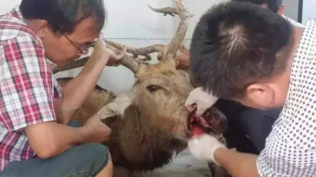 医护人员正在救治麋鹿在项目职工的细心照料和相关机构的专业救护下,受伤的麋鹿最终得到了妥善的救治。